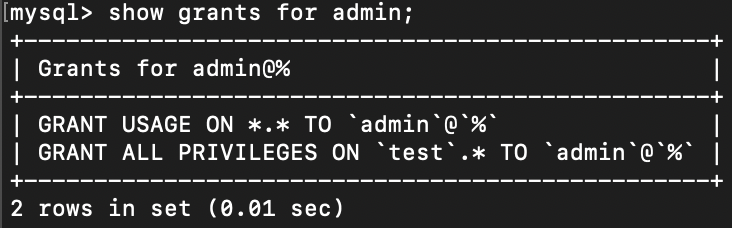 7. test DB에 대한 사용자 생성 후 해당 DB에 대한 모든 권한을 부여