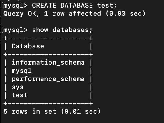 6. 테스트 용도의 테이블인 "test" 테이블을 생성한다.