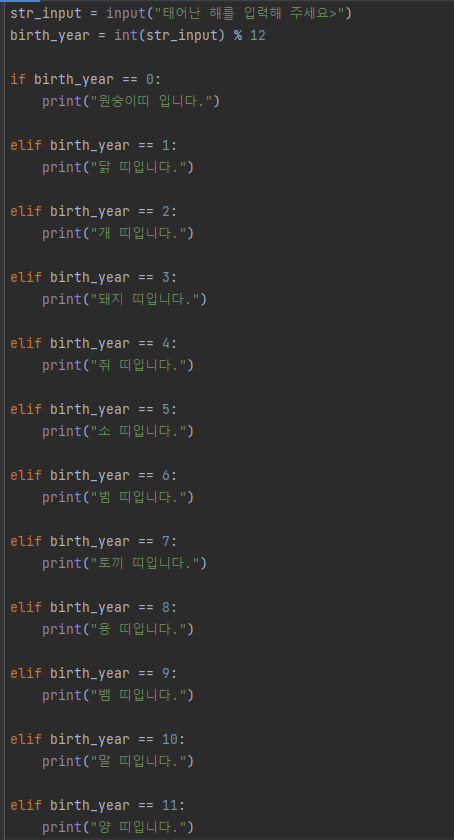 [ 문제 ] _ 사용자에게 태어난 연도를 입력받아 띠를 출력하는 프로그램을 작성해주세요. 작성 시 입력받은 연도를 12로 나눈 나머지를 사용합니다. 나머지가 0,1,2,3,4,5,6,7,8,9,10,11일 때 각각 원숭이, 닭, 개, 돼지, 쥐, 소, 범, 토끼, 용, 뱀, 말, 양띠입니다.