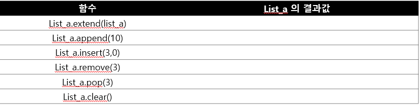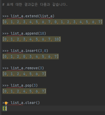 list_a = [ 0, 1, 2, 3, 4, 5, 6, 7] 입니다. 다음 표의 들을 실행했을 때 list_a의 결과가 어떻게 나오는지 적어보세요