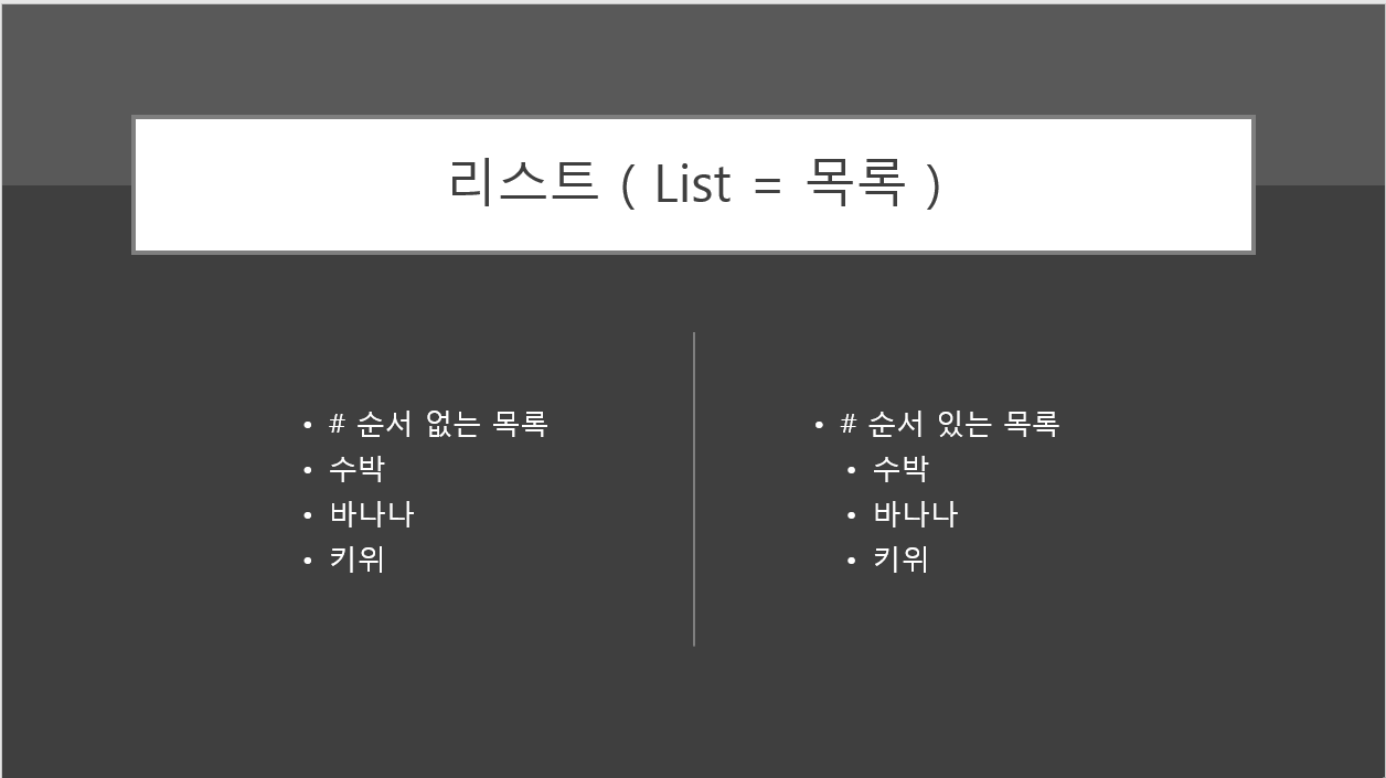 대괄호 [ ] 내부에 넣는 자료를 "요소" 라고 하고 영어로는 element라고 부른다.