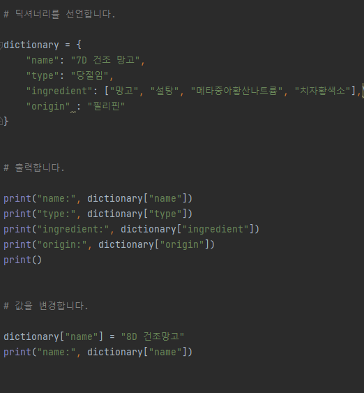 딕셔너리를 활용하여 간단한 실습을 진행하자면