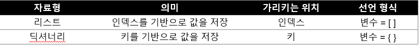 리스트가 '인덱스를 기반으로 값을 저장하는 것'이라면 딕셔너리는 '키를 기반으로 값을 저장하는 것' 이라고 할 수 있다.