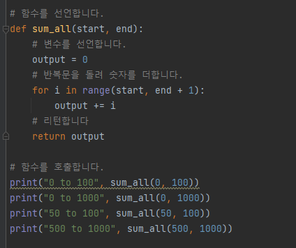 | 파이썬에서 함수란 " 코드의 집합" 이다. |