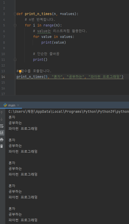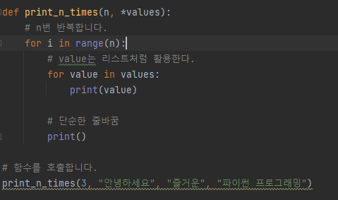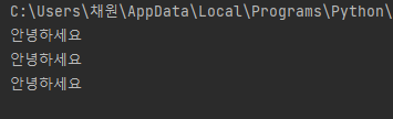 안녕하세요를 3번 "Print 함수" 에 넣었으니 결과값 역시 "안녕하세요"가 3번 나오게 되는 것이다.