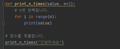 - 기본 매개변수는 "매개변수=값"의 형태를 띄며, 기본매개변수 뒤에는 일반 매개변수가 올 수 없다.