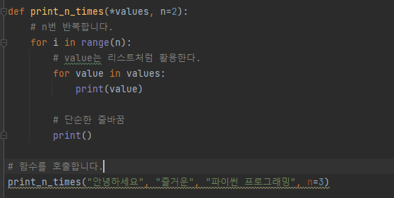 이러한 가변매개변수와 기본매개변수를 함께 사용할 수 있도록 만든 것이 바로 "키워드 매개변수"이다.