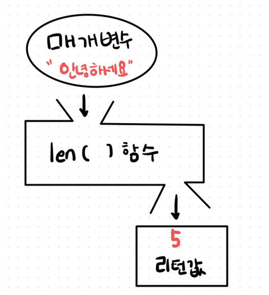 위 그림에선 len ( ) 함수를 통해 설명을 하였는데, "안녕하세요"라는 매개변수는 5글자로 이루어져 있어 len ( ) 함수를 호출하면 5라는 리턴값을 얻을 수 있는 것이다.